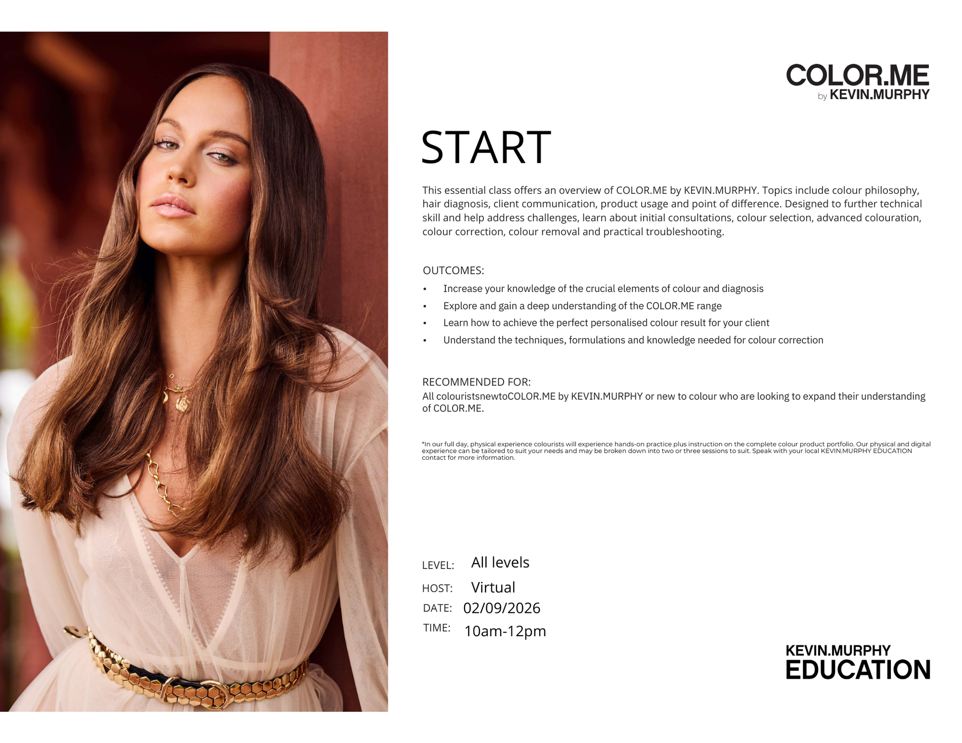 This essential class offers an overview of COLOR.ME by KEVIN.MURPHY. Topics include colour philosophy,hair diagnosis, client communication, product usage and point of difference. Designed to further technicalskill and help address challenges, learn about initial consultations, colour selection, advanced colouration,colour correction, colour removal and practical troubleshooting.